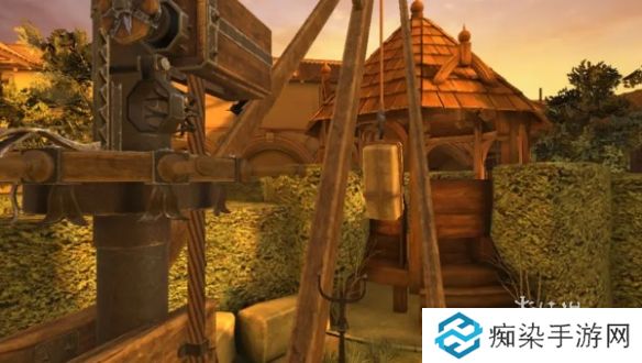 20、回到过去,进入右侧房间,将梯子转到左侧,点击爬上梯子,得到把手,将把手安装在轮子附近,旋转把手降低梯子。