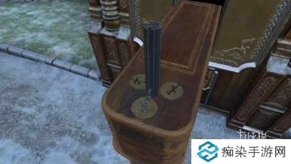 19、旋转银盒上的宝石,得到黄铜字母,回到凉亭,拉动把手,来到图中位置拾取金属饰钮,获得饰钮把手。