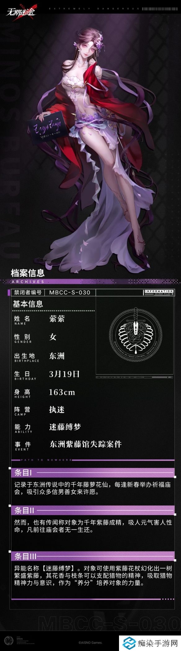 *条目III:异能名称【迷藤缚梦】。对象可使用紫藤花杖幻化出一树繁盛紫藤,其花香与枝条可以支配猎物的精神,吸取猎物精神力与意识,作为“养分”培养对象的力量。