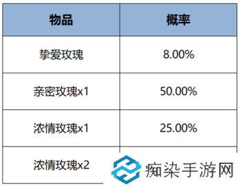 购买红蓝对决(1日),可额外获赠一个礼包,打开后可随机获得以下之一:挚爱玫瑰x1、亲密玫瑰x1、浓情玫瑰x1、浓情玫瑰x2。累计20次至少可获得挚爱玫瑰x1。