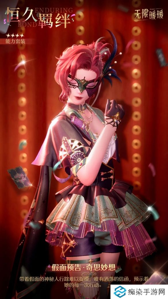 套装能力「假面预告·奇思妙想」:可在原地进行一场假面表演,带着假面的神秘人行踪难以捉摸,唯有洒落的信函,预示着她的每一次行动。
