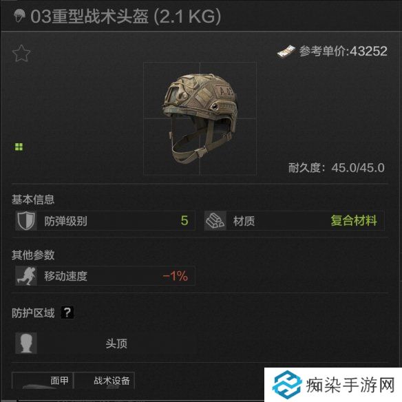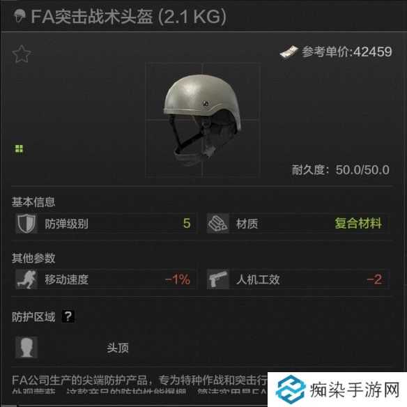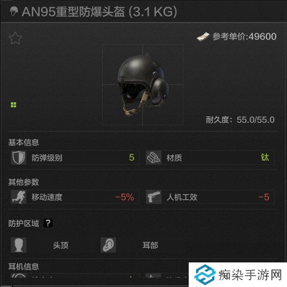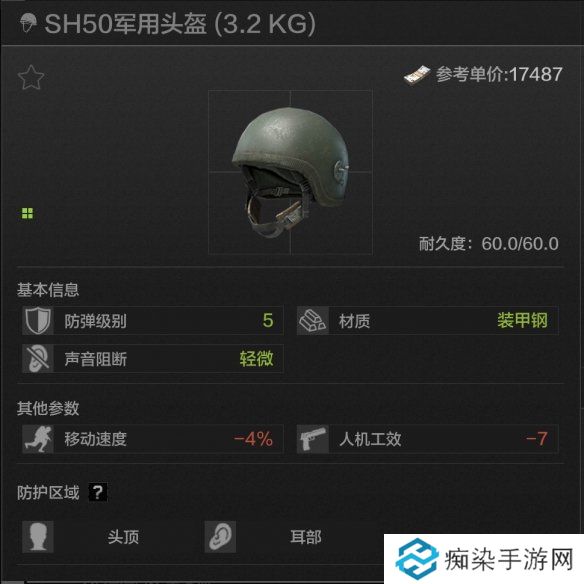 50耐久,头顶防护,五级头盖骨,虽然材料一般,但debuff扣除不多,也方便加装防毒面罩,是 非常实用 的一款头盔。