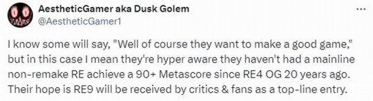 Dusk Golem继续说:“我知道有人会说:‘他们当然想做一款好游戏’,但我的意思是,他们很清楚在《生化危机4》原版之后,还没有一款主流非重制版作品在Metacritic上达到90分以上。他们希望《生化危机9》能被媒体和玩家们视为一款顶级作品。”