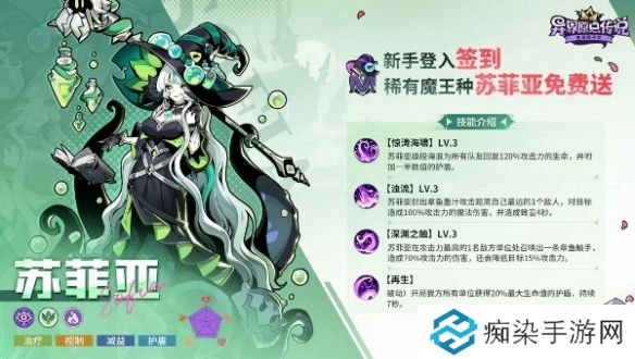 1、苏菲亚是一位签到就送的辅助角色,本身自带回复、加盾、控制。