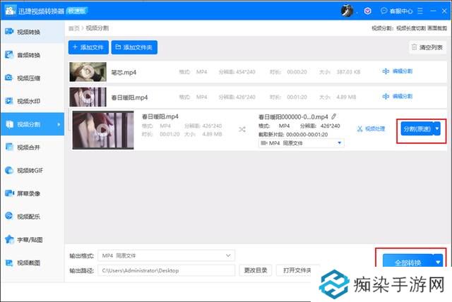 选择好需要分割的部分之后,我们可以看到在原视频的下方会显示出一个新的片段,点击视频右侧的“分割”或者下方的“全部转换”就完成了。
