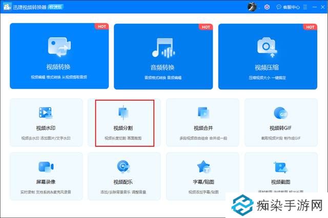 首先打开电脑上的“迅捷视频转换器”,看到软件·的第二行第二列的“视频分割”选项,点击选择。