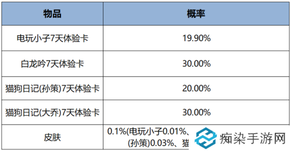 打开后必得皮肤碎片x2、铭文碎片x100和以下随机奖励之一:皮肤或皮肤体验卡(7日)1张(鲁班七号-电玩小子、韩信-白龙吟、孙策-猫**记、大乔-猫**记)