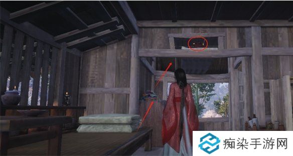 2、在屋内的房梁上,从床上跳到柜子上,再跳上房梁即可。