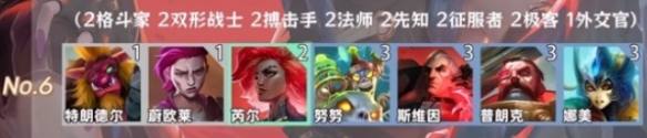 2、羁绊组成:2格斗家、2双形战士、2哨兵、2法师、2先知、2征服者、2极客、1外交官