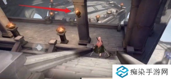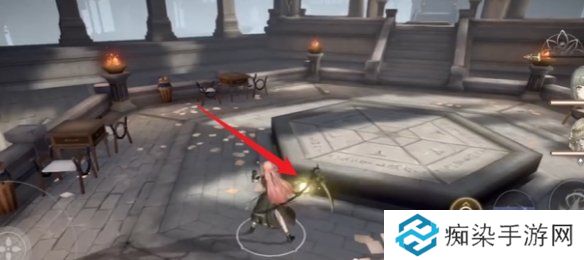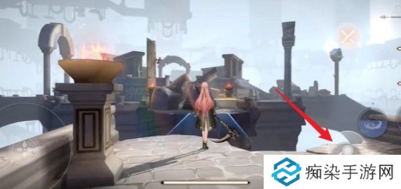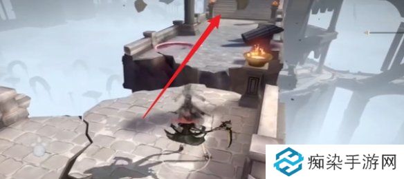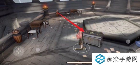 3、站在图中的位置,点击箭头处的技能,注意调整好位置,即可过去开启宝箱。