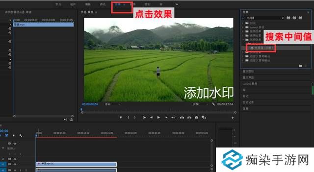 第一步 PR的所有操作都是新建一个项目,我们首先新建一个视频项目。然后点击【效果】,搜索【中间值】,并将其添加到视频中去。