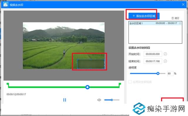 第二步 点击他【添加去水印区域】,将弹出的矩形框拖动到水印所在的位置,并调整其大小直至能完全覆盖住水印即可。调整透明度到看不到水印即可,点击【确定】,返回到上一个页面。