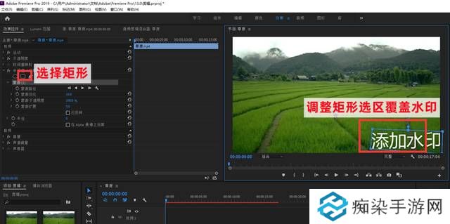 第二步 在左侧效果控件,点击【矩形】,然后调整矩形选区直到完全覆盖水印所在的位置。