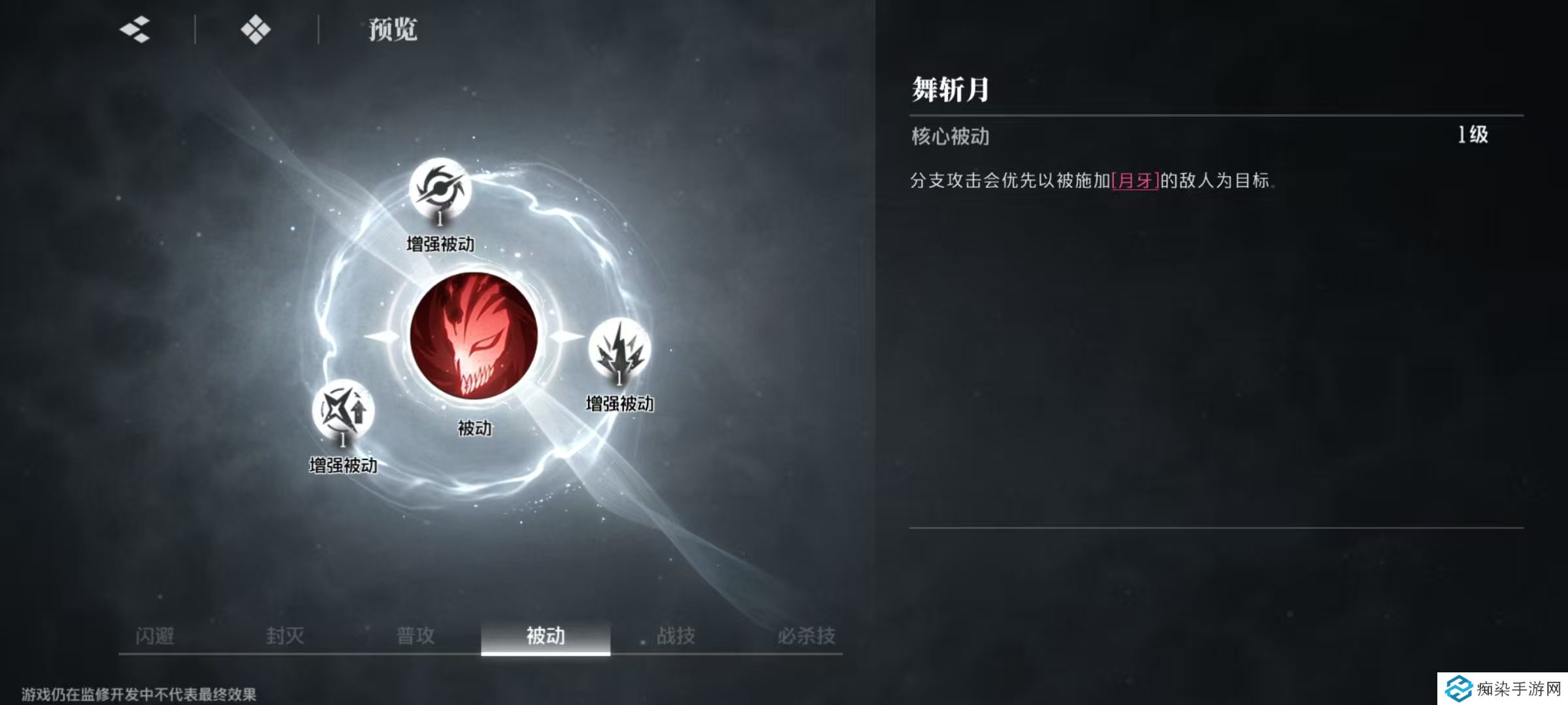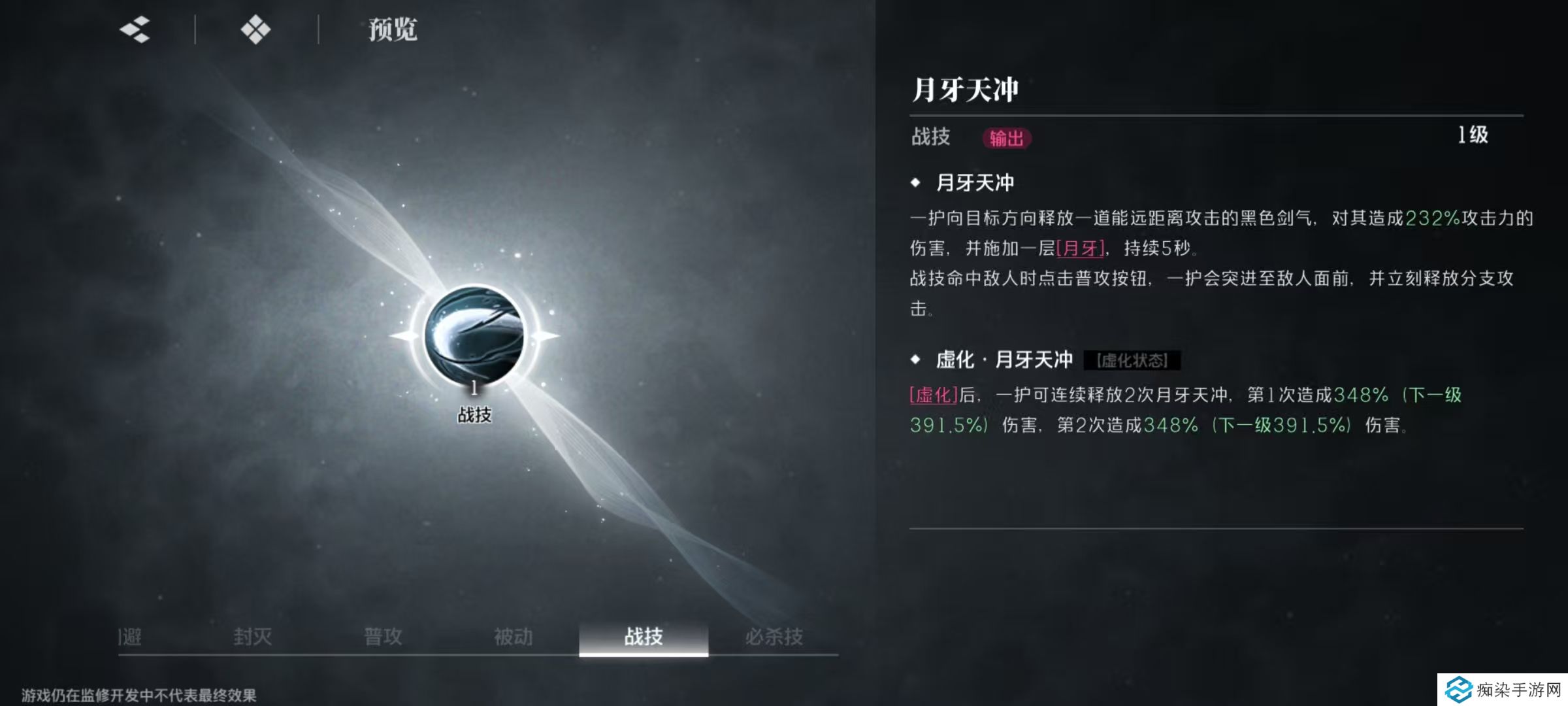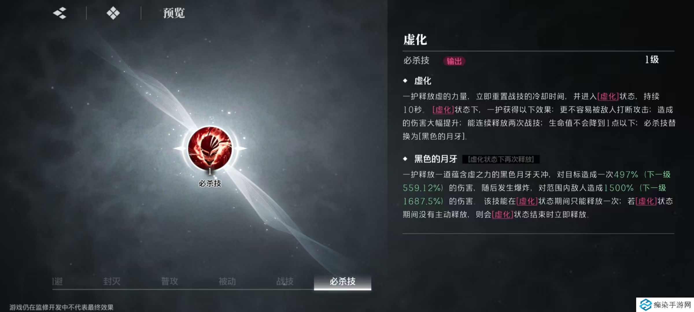 战技月牙天冲,向目标释放一道远距离攻击的剑气,造成伤害后为其添加一层月牙,持续5秒钟。命中敌人时可以直接点击普攻按钮,这样就会突进到敌人面前,立刻释放分支攻击。在虚化之后还可以连续释放两次月牙天冲。必杀技是虚化释,放出虚的力量,立即重置战技冷却时间,并进入虚化状态,在此状态下不容易被敌人打断,造成伤害提升,可释放连续两次战技,生命值不会降低到一点以下。此时必杀技会替换成黑色的月牙,该技能在虚化期间只能释放一次。
