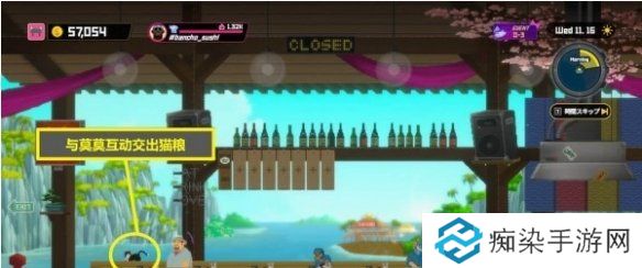 4、白天前往寿司店,与柜台上的莫莫互动,交给它猫粮并喂食。