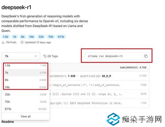 7、选择要下载的数据模型,一般点击1.5b或7b即可,然后复制后边的代码。