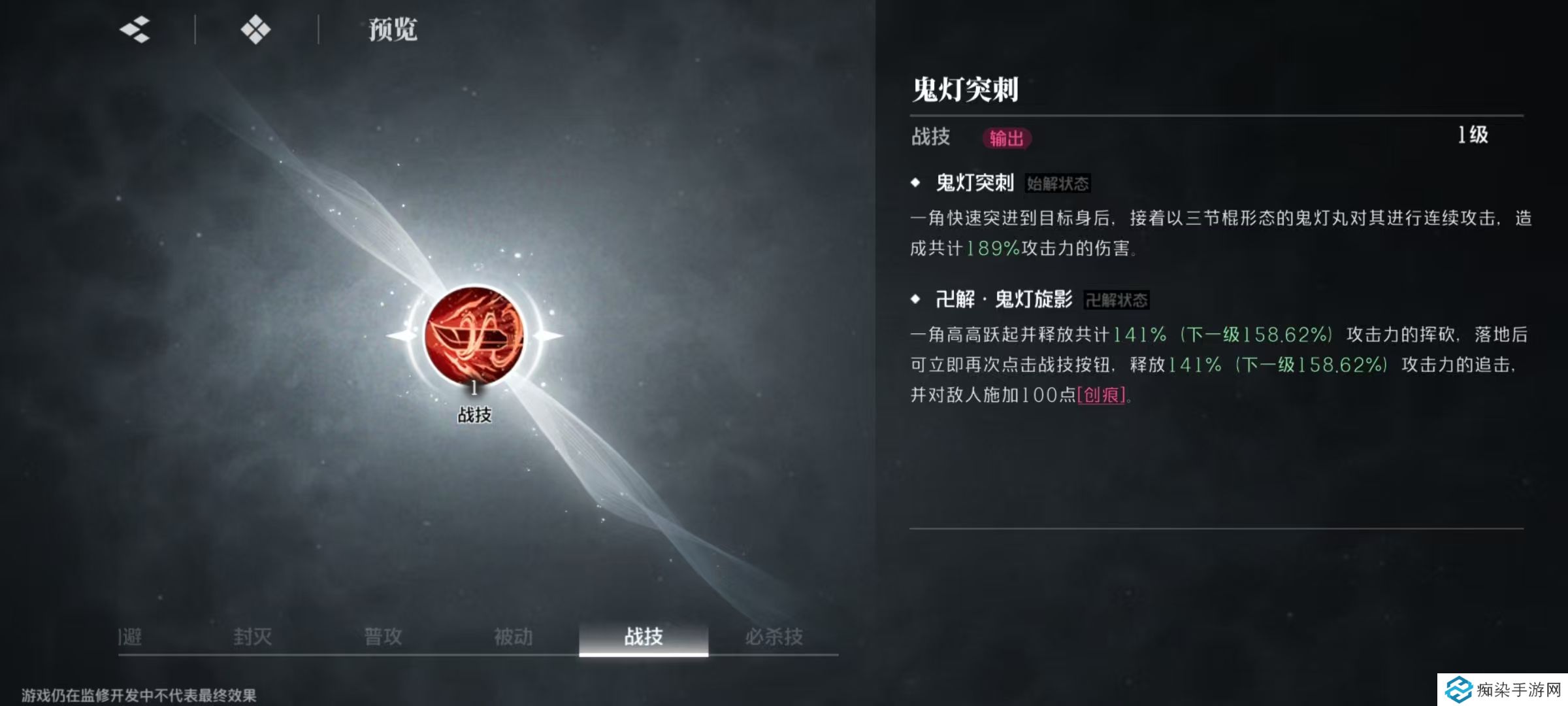 自身的战技是鬼灯突刺,快速突进到目标身后,对目标进行连续攻击造成高额伤害。在万解之后会高高跃起造成挥砍,落地之后可以再次点击战技按钮,释放一次强力的追击,并对敌人施加创痕。每层创痕都可以使敌人受到额外的伤害,持续10秒钟,可叠加到20层,叠加起来之后伤害还是比较可观的。