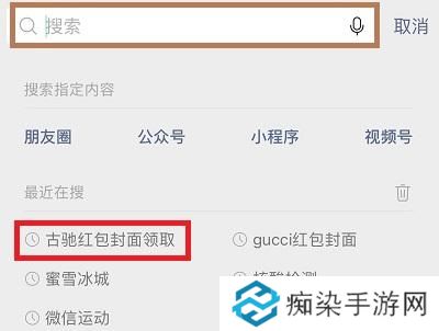 1、大家先进入微信,然后输入红包名,比如“古驰红包封面领取”。