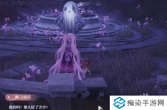 2、然后在雕像前点击等待,坐在长椅上,和幽灵哨兵进行对话。