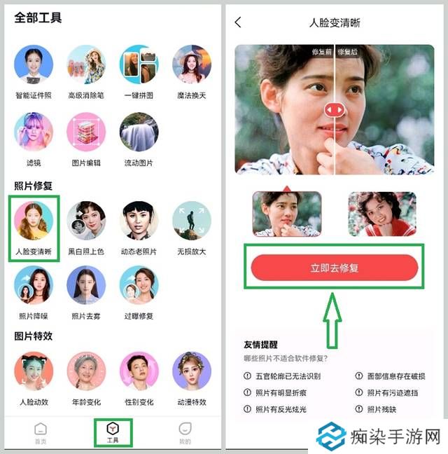 打开之后选择【工具】-【照片修复】-【人脸变清晰】,点击【立即去修复】,上传我们的模糊照片。