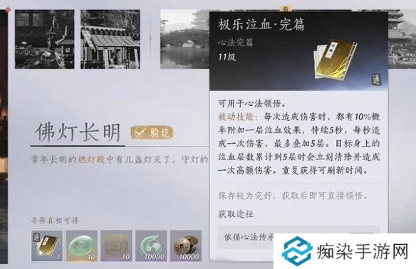 14、完成任务后,在万事知中的佛灯长明任务奖励中领取极乐泣血心法。