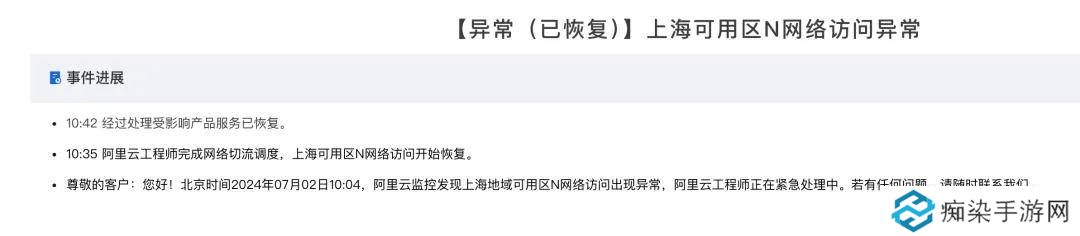 2024 年 07 月 02 日 10:04,阿里云监控发现上海地域可用区 N 网络访问出现异常。10:35 阿里云工程师完成网络切流调度,上海可用区 N 网络访问开始恢复。10:42 经过处理受影响产品服务已恢复。